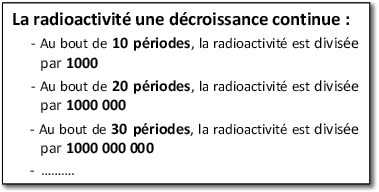 Eh bien non, pas du tout pour ce qui est de leur nocivité. Car vis-à-vis de la durée, les produits radioactifs ont une particularité : ils se détruisent par leur désintégration, ce qui diminue leur radioactivité, et ils se transforment en produits stables au bout d’un temps qui peut être long pour certains d’entre eux, à la différence de la toxicité des déchets chimiques qui peut se maintenir éternellement. Ils disparaissent d’autant plus rapidement qu’ils sont plus radioactifs. Ceci se comprend aisément (plus élevé est le débit, plus vite la source se tarit). On caractérise la radioactivité par "la période", c'est la durée au terme de laquelle la radioactivité a diminué de moitié. Ainsi au bout de 10 périodes, la radioactivité a été divisée par 1024 (2x2x2…x2 dix fois de suite).