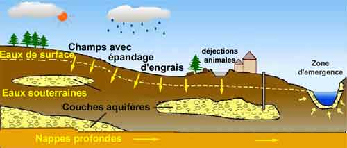 L’excès d’engrais nitratés d’origine agricole est entraîné par les pluies dans les cours d’eau voisins, les nappes phréatiques, les lacs, les mers etc.