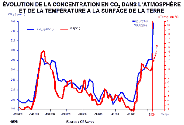 * On connaît maintenant assez bien l’évolution du climat et des teneurs en CO2 sur Terre au cours des dernières 600 millions d’années ; il y a eu des variations considérables de teneur en CO2, mais étalées sur des milliers, voire des centaines de milliers d’années ; jamais les variations n’ont été aussi rapides qu’actuellement