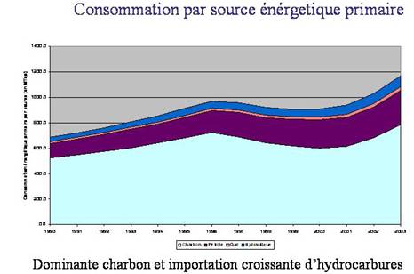 Depuis 2000, la consommation d’énergie primaire est repartie fortement à la hausse pour atteindre 1031 Mtep en 2002 (+9,7%), du fait d’une augmentation de toutes les sources énergétiques primaires dans des proportions sensiblement égales.