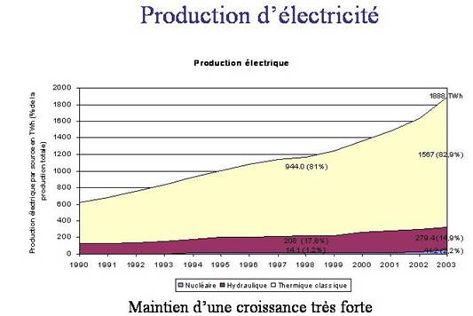 Rappelons que malgré une production d'électricité d’environ 1900 TWh en 2003, la consommation par habitant dépasse à peine les 1400 kWh par an, ce qui est bien moins que la consommation mondiale moyenne par habitant (2550 kWh par an en 2000), et bien en deçà des consommations moyennes par habitants de l’Europe ou des Etats-Unis (11 fois moins que les USA et 5 fois moins que la France en 2003).