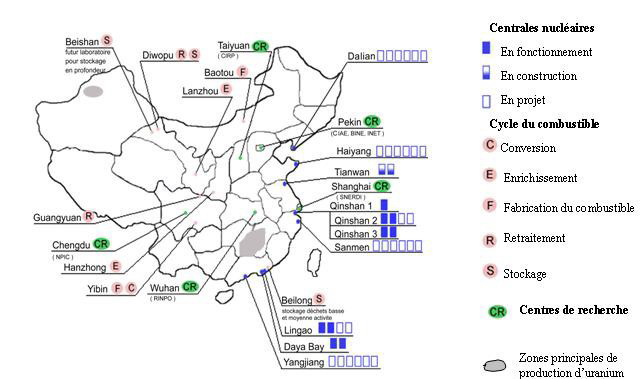 Comme toutes les puissances atomiques, la Chine a commencé son programme nucléaire dès les années cinquante, par des recherches sur les applications militaires de la fission nucléaire. Celles-ci ont été grandement facilitées par l’accord de coopération nucléaire signé le 27 avril 1955 entre la Chine et l’Union Soviétique. Très rapidement en mai 1956, la construction du premier réacteur expérimental à eau lourde a débuté à l’Institut CIAE proche de Pékin, suivie par la création du Ministère de l’Industrie Mécanique N°2, chargé du développement de l’énergie atomique, tourné essentiellement vers des fins militaires. C’est ainsi qu’ont été lancés simultanément les projets d’une usine d’enrichissement de l’uranium (par diffusion gazeuse) à Lanzhou (Gansu), d’une usine de retraitement à Diwopu (Gansu), de recherches minières de l’uranium dans le Jiangxi, d’une usine de conversion du florure d’uranium à Baotou (Mongolie Intérieure). Malgré la rupture[3] des relations sino-soviétiques en juillet 1960, le programme nucléaire militaire chinois a abouti le 16 octobre 1964 à l’explosion de la première bombe à fission nucléaire, suivie le 16 juin 1967 par le premier essai de bombe à hydrogène. La coopération nucléaire civile entre la Chine et la Russie s’est néanmoins poursuivie et ces dernières années la Chine a entrepris la construction de plusieurs installations nucléaires avec le soutien technique russe :