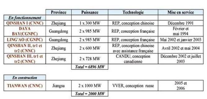 · 2 tranches CANDU 700 MWe à eau lourde fournies clé en main par l’industrie nucléaire canadienne à Qinshan 3. Les 2 tranches sont en service actuellement.