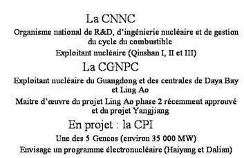 La Chine envisage officiellement un programme électronucléaire conséquent de l’ordre de 25 à 30 nouvelles tranches d’ici à 2020 (c’est à dire arriver à 4% d’électricité d’origine nucléaire). Il s’agit d’une part modeste de la capacité installée mais un programme quantitatif ambitieux d’environ 2 à 3 tranches à lancer par an ce qui suppose une organisation industrielle adaptée or aujourd’hui celle-ci est très dispersée (plusieurs insituts d’ingénierie, 3 grands industriels, 2 exploitants nucléaires).