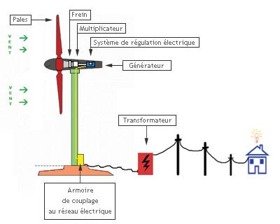Une hélice entraînée en rotation par la force du vent permet via un rotor la production d’énergie mécanique couplée à une génératrice qui convertit l’énergie mécanique en énergie électrique distribuée sur le réseau via un transformateur ou un convertisseur..