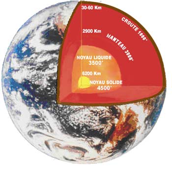 - le noyau, composé de fer et de nickel a un rayon d’environ 3500 kilomètres et une température d’environ 4 200°C.