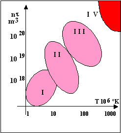 On pourra trouver sur le diagramme ci-contre un aperçu de la progression des paramètres température (T) et densité x temps de confinement (n) obtenus dans les différentes expériences menées dans le monde.