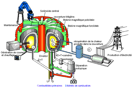 Le mélange combustible deutérium-tritium est injecté (1) dans une chambre où, grâce à un système de confinement, il passe à l'état de plasma et brûle (2). Ce faisant, le réacteur produit des cendres (les atomes d'hélium) et de l'énergie sous forme de particules rapides ou de rayonnement (3). L'énergie produite sous forme de particules et de rayonnement s'absorbe dans un composant particulier, la "première paroi", qui, comme son nom l'indique, est le premier élément matériel rencontré au-delà du plasma. L'énergie qui apparaît sous forme d'énergie cinétique des neutrons est, quant à elle, convertie en chaleur dans la couverture tritigène (4), élément au-delà de la première paroi, mais néanmoins à l'intérieur de la chambre à vide. La chambre à vide est le composant qui clôt l'espace où a lieu la réaction de fusion. Première paroi, couverture et chambre à vide sont bien évidemment refroidies par un système d'extraction de la chaleur. La chaleur est utilisée pour produire de la vapeur et alimenter un ensemble classique turbine et alternateur producteur d'électricité (5). |