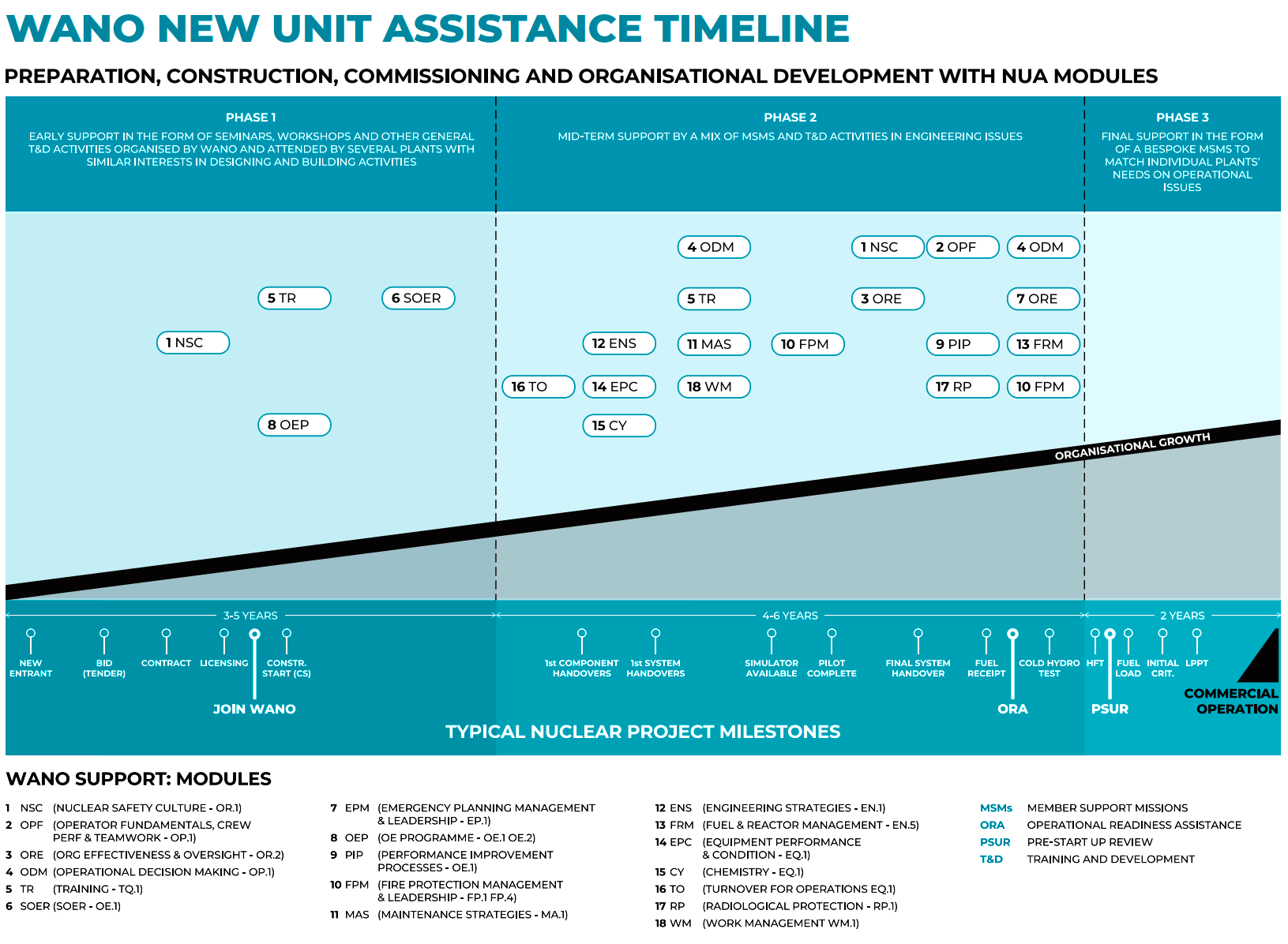 Le lecteur pourra trouver sur le site de Wano les informations sur les modules mis en place par WANO pour la conception, la construction et le lancement d'installations nucléaires Un aperçu figure ci-contre. (Il est certain que l’AIEA fait aussi le nécessaire dans ce but.)