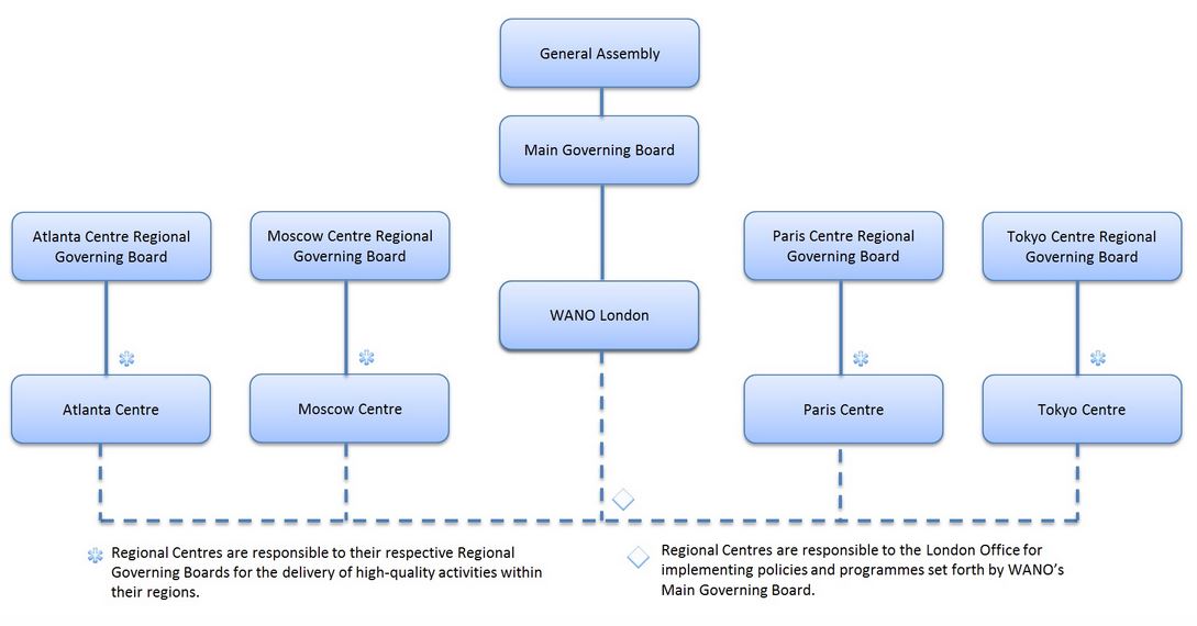 Chaque membre de WANO, c’est-à-dire chaque société propriétaire ou exploitant - ou se préparant à exploiter - une ou plusieurs centrales nucléaires, doit se rattacher à au moins un des Centres régionaux, qui lui apportera les services de WANO, son assistance, et l’accès au site privé de WANO (qui est en fait tenu par Londres, comme on le verra plus loin).