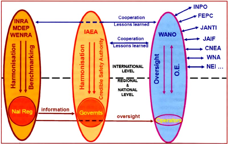 La figure ci-contre, a été présentée à la Convention SFEN de 2012, peu après Fukushima, par Laurent Stricker, alors Chairman de WANO. Elle montre la plupart des organismes intervenant dans la sûreté. Elle est un peu ancienne, suggère plutôt qu’elle ne décrit de façon précise, mais elle est intéressante.