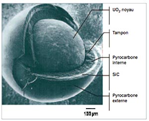 Le combustible TRISO Le concept de combustible dispersé, associé à la maîtrise du rapport de modération, constitue une évolution majeure des combustibles nucléaires. Il permet une bonne maîtrise du spectre neutronique ; la grande surface spécifique des particules contenant les isotopes fissiles permet un bon échange thermique avec la matrice de graphite et ensuite l’hélium caloporteur ; le combustible entièrement réfractaire permet un fonctionnement à haute température, ce qui est favorable au rendement de conversion et permet d’encaisser une éventuelle perte de fluide caloporteur ; la forme sphérique des particules donne aux couches de revêtement une grande résistance mécanique, ce qui permet d’atteindre des taux de combustion élevés. Par contre, le retraitement d’un tel combustible est extrêmement difficile ce qui induit presque nécessairement un cycle ouvert sans recyclage. Mais la possibilité d’atteindre des très hauts taux de combustion compense partiellement cet inconvénient. |