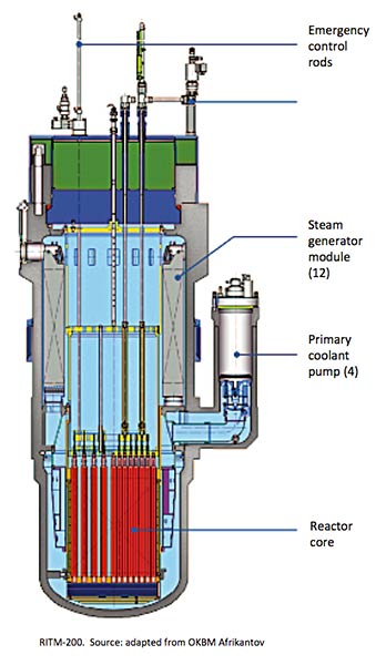 Un modèle terrestre est envisagé pour le RITM-200, avec deux modules ou plus, un enrichissement en U235 toujours proche de 20%, pour un cycle de 5-7 ans entre deux rechargements.