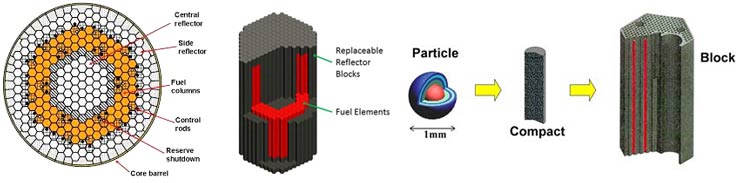 Le cœur est constitué de combustible TRISO comprenant 10 milliards de particules réparties dans des blocs cylindriques de graphite, assemblés en 102 colonnes annulaires entourées d’un réflecteur en graphique, et d’un réflecteur central (notons que ces mêmes dispositions pourraient être adoptées pour des modèles beaucoup moins puissants, jusqu’à 16 MWth).