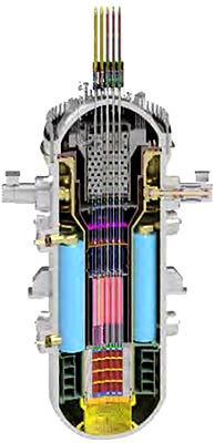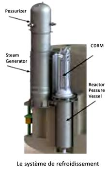 C’est un modèle compact. La cuve du réacteur intègre le cœur, 8 GV, 4 pompes de circulation, le pressuriseur et 25 mécanismes de barres de contrôle et 4 réservoirs d’appoint en eau pour le refroidissement d’urgence et l’évacuation de la puissance résiduelle.