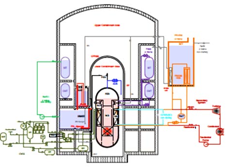 L’évacuation de la puissance résiduelle est assurée par 2 trains indépendants fonctionnant en circulation naturelle et transférant l’énergie vers l’extérieur du caisson sans utiliser le SGV.