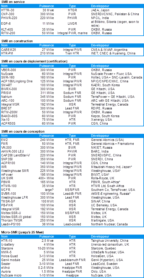Principaux projets SMR (12/ 2020) (Source AIEA+NEA) |