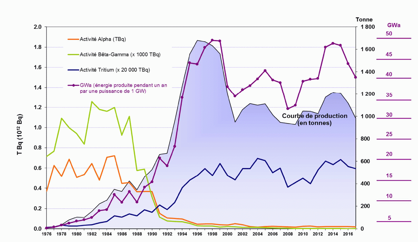 La courbe suivante montre les progrès réalisés. Hormis le tritium, dont la quantité rejetée est pratiquement fonction de la quantité de combustible retraitée, les rejets ont fortement diminué depuis le démarrage de l’usine malgré l’augmentation des quantités traitées (courbe grise à lire sur l’échelle de droite). Leur niveau est aujourd’hui de l’ordre du centième de ce qui est autorisé, malgré l’abaissement des limites. Des efforts continus sont néanmoins poursuivis, tant dans les méthodes d’exploitation que dans l’amélioration des procédés, pour continuer à réduire les rejets, notamment de tritium, particulièrement ciblé par OSPAR malgré l’insignifiance de son impact. Mais aucune technique nouvelle ne s’avère disponible pour le moment.